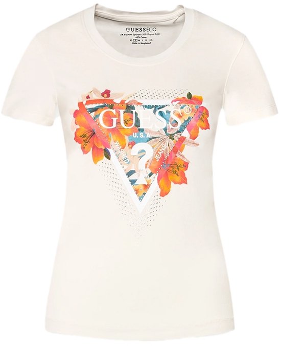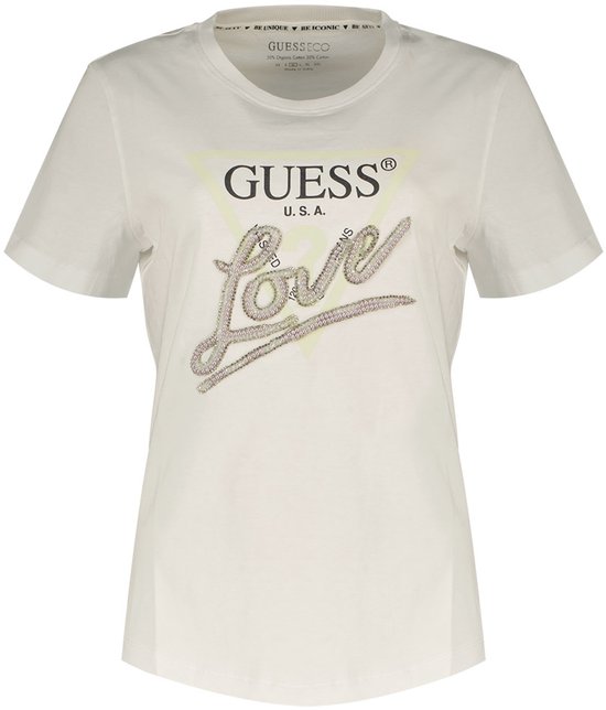 Kleur: puur witSamenstelling: 95% katoen, 5% elastaanMouwen: kortHalslijn: ronde halsPasvorm: slankDetails: oversized logo op de voorkant versierd met strass-steentjes, stretch jerseystof, vrouwelijke snit die het silhouet accentueertDuurzaamheid: het kledingstuk bevat biologische katoenvezelsGebruik: perfect om een casual chique look af te maken met een vleugje glitter, draag met jeans of een high-waist broek voor een frisse en vrouwelijke stijl