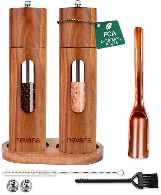 Duik in de wereld van natuurlijke schoonheid met onze peper- en zoutmolens, vervaardigd uit duurzaam acaciahout met het prestigieuze FSC keurmerk. Niet alleen voegen ze een vleugje warmte toe aan je keuken, maar ze belichamen ook onze toewijding aan het milieu.