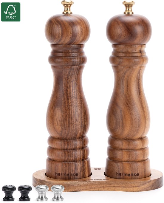 Altijd elk gerecht perfect op smaak brengen? Deze Hermanos® Pepermolen en Zoutmolen Set zijn uniek en passen in elk keukeninterieur door de uitwisselbare knoppen in zwart, zilver en goud! Hierdoor bepaal jij welk kleuraccent je aan jouw acacia peper -en zoutmolens set wilt geven! Deze Hermanos® Peper en Zoutmolen Set van 22 cm is vervaardigd uit hoogwaardig en duurzaam (met FSC keurmerk) acaciahout. Deze hoogwaardige molens hebben zowel een stalen maalmechaniek voor peper als een keramisch maalmechaniek voor zout, waarmee je elke korrel met weinig inspanning vermaald.